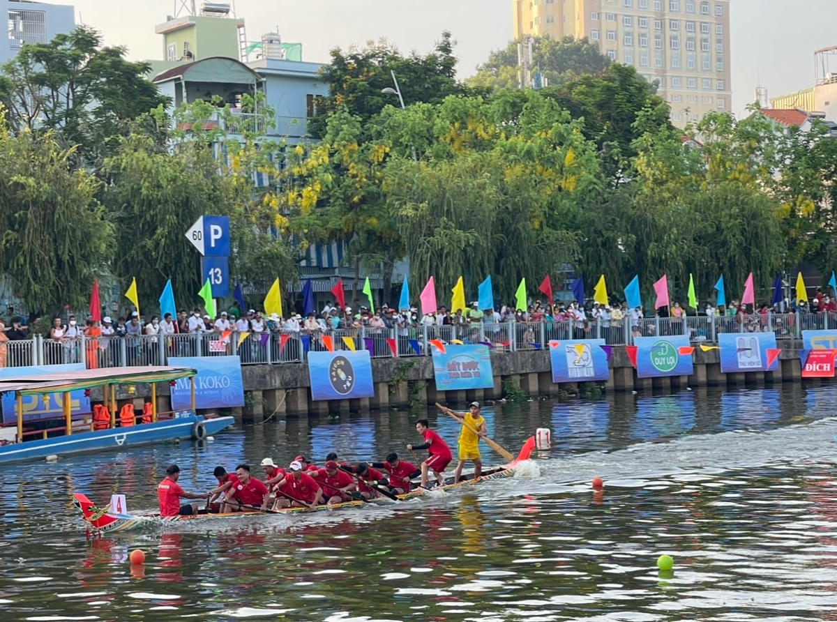 Có 9 đội tới từ 5 tỉnh thành phố phía Nam đã tham gia tranh tài trong cuộc thi đua ghe ngo rất độc đáo ở dọc kênh Nhiêu Lộc-Thị Nghè.