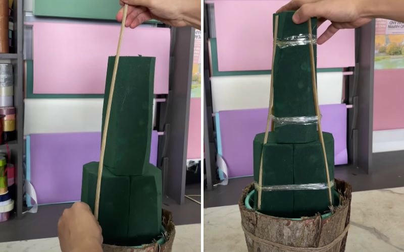 Bước 2: Đặt xốp vào chậu sứ theo chiều thẳng đứng. Bạn nén miếng xốp bên trong thật chắc chắn. Kế tiếp cho tiếp miếng xốp còn lại lên trên. Dùng que tre và băng keo trong cố định các miếng xốp với nhau. Sau đó dùng dao cắt xốp theo hình dáng cây thông.