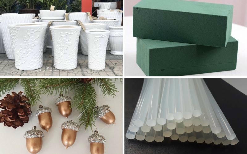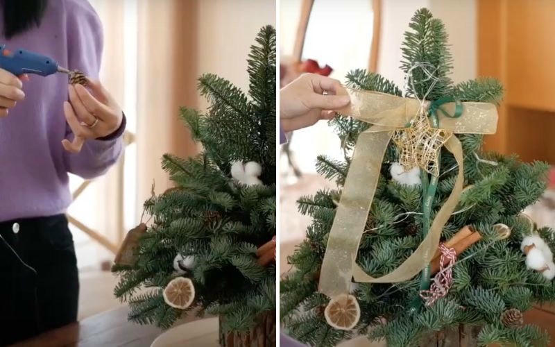 Bước 4: Khi các cành thông đã cắm xong, bạn bắt đầu trang trí cây thông bằng những phụ kiện xinh xắn như quả châu, ngôi sao, quế, hồi,...