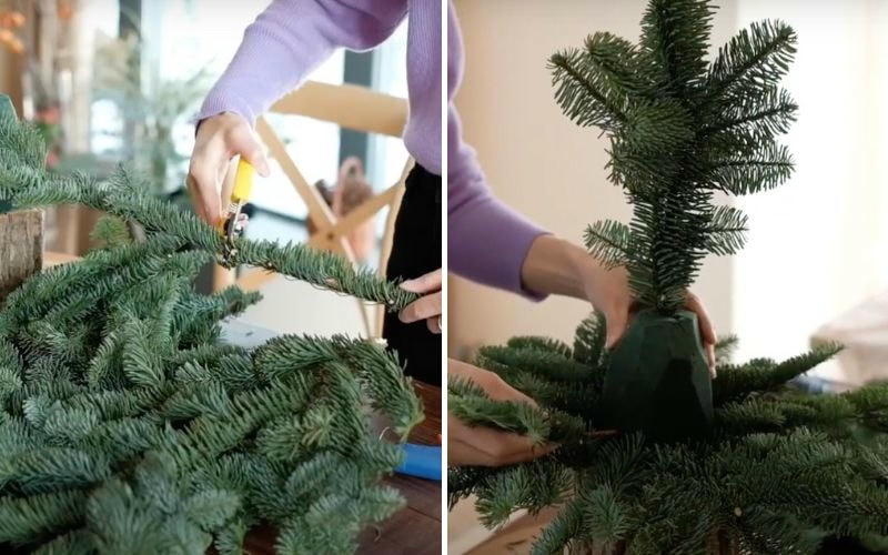 Bước 3: Bạn chọn cành thông đẹp và thẳng nhất để làm ngọn rồi cắm vào phần đỉnh phía trên. Lần lượt cắm tất cả các nhánh còn lại sao cho đều các phía. Lưu ý, tầng lá phía trên phải ngắn hơn so với phía dưới.