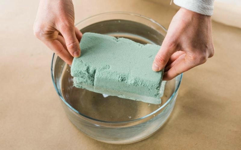 Bước 1: Bạn dùng keo nến làm kín đáy chậu sứ để tránh làm thoát nước ra bên ngoài. Ngâm xốp cắm hoa vào nước sao cho miếng xốp tự hút nước và đợi cho đến khi xốp chìm hẳn.