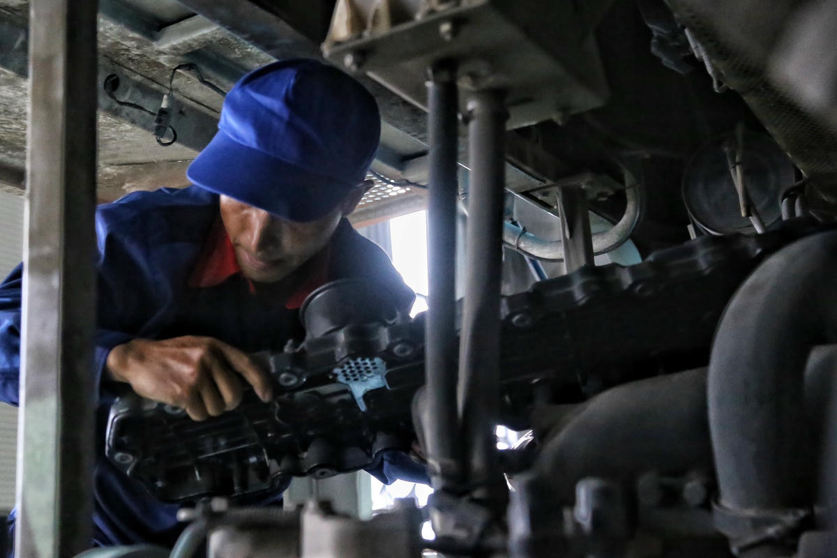 Anh Nguyễn Duy Tuyên - Đội trưởng đội bảo dưỡng sửa chữa xe buýt xí nghiệp xe buýt Hà Nội chia sẻ, hiện nay xe buýt đang vận hành trong điều kiện vô cùng khắc nghiệt. Thời gian vận hành một ngày rất lớn, từ 5h sáng xe đã lăn bánh hoạt động đến 22h đêm. Hơn nữa, trong quá trình vận hành, tải trọng không ổn định, người lên người xuống liên tục, hệ thống số và phanh phải hoạt động hết công suất, thậm chí vài trăm mét xe lại phải dừng đỗ một lần để đón trả khách...