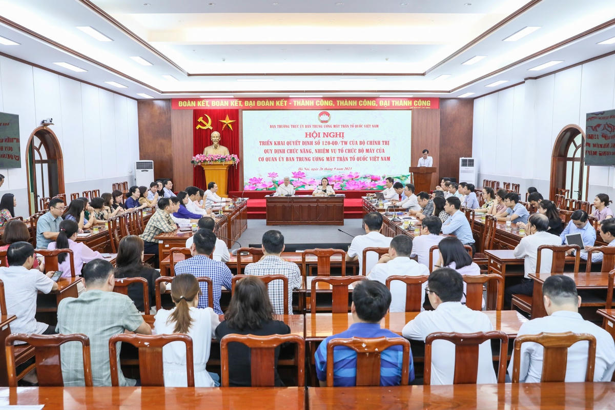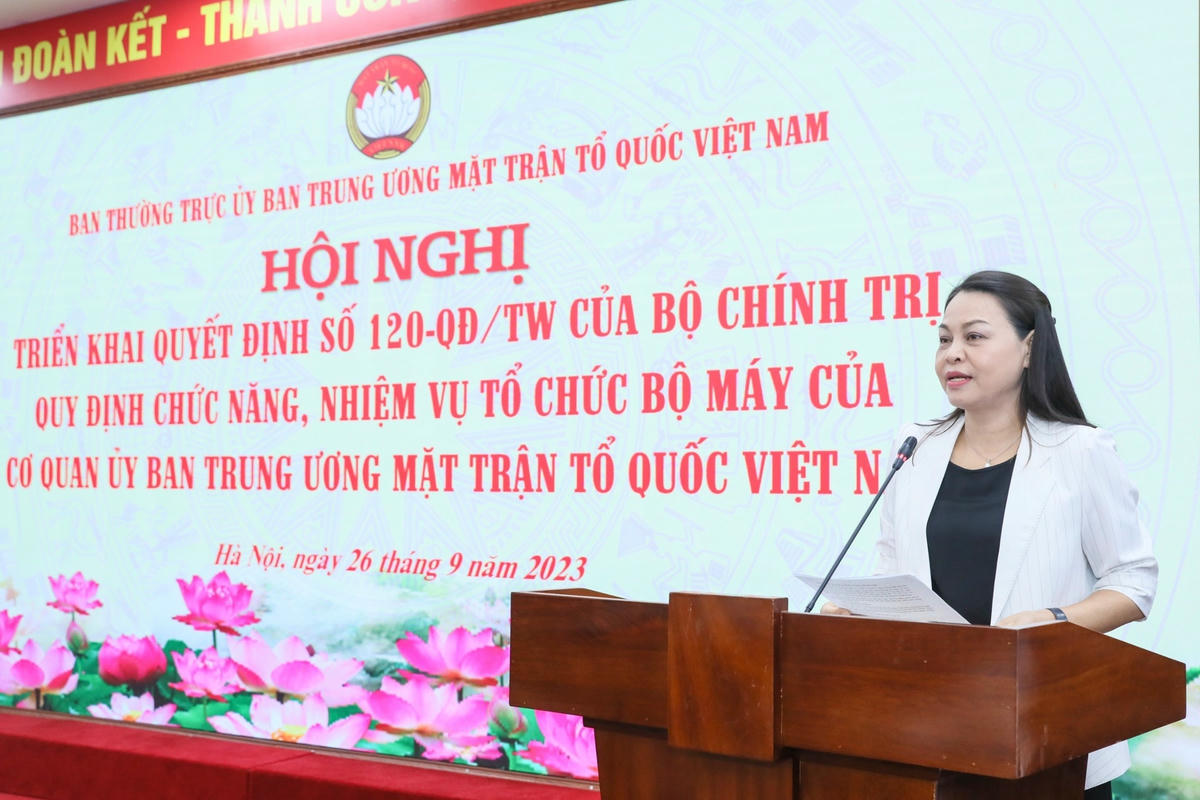 Tại Hội nghị, Phó Chủ tịch - Tổng Thư ký UBTƯ MTTQ Việt Nam Nguyễn Thị Thu Hà đã công bố Quyết định số 120-QĐ/TW của Bộ Chính trị quy định chức năng, nhiệm vụ tổ chức bộ máy của cơ quan UBTƯ MTTQ Việt Nam.