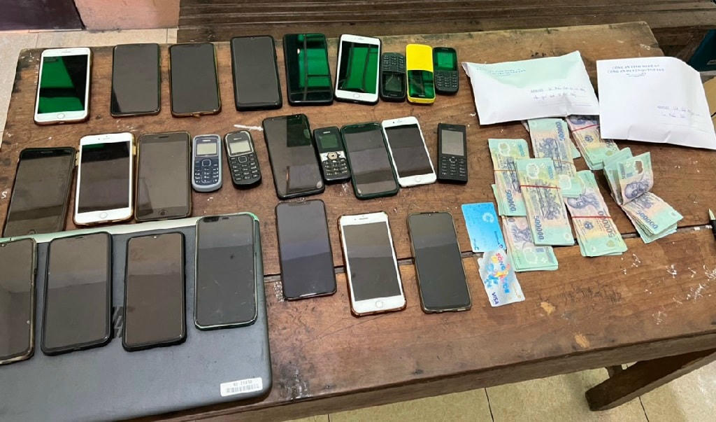 Tại hiện trường, cơ quan chức năng thu giữ tang vật gồm: 2 cáp đề, 23 điện thoại di động, 1 máy tính xách tay, 250 triệu đồng và 5 thẻ ATM.