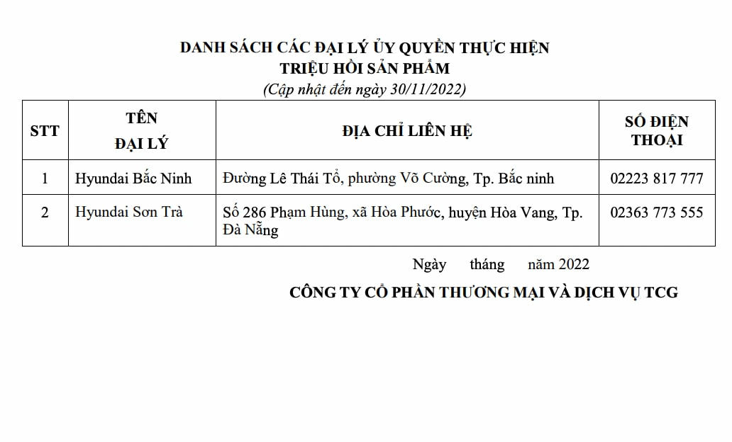 Theo đó, cả 2 đợt triệu hồi mỗi xe mất 0,7 giờ để kiểm tra và thay thế bộ phận. Công ty Cổ phần sản xuất ô tô Hyundai Thành Công Việt Nam và các đại lý được ủy quyền sẽ kiểm tra, khắc phục miễn phí lỗi của những xe bị ảnh hưởng.