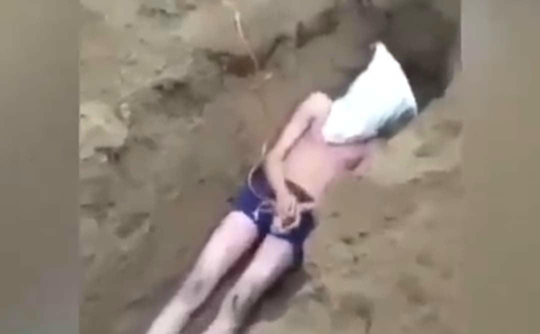 Ngoài ra, nhóm người trên còn đào hố sau đó trói tay, lấy bao tải trùm đầu nam thanh niên rồi đẩy xuống hố để chôn sống. Bất chấp nam thanh niên liên tục gào khóc, van xin "cho em một cơ hội nữa"....