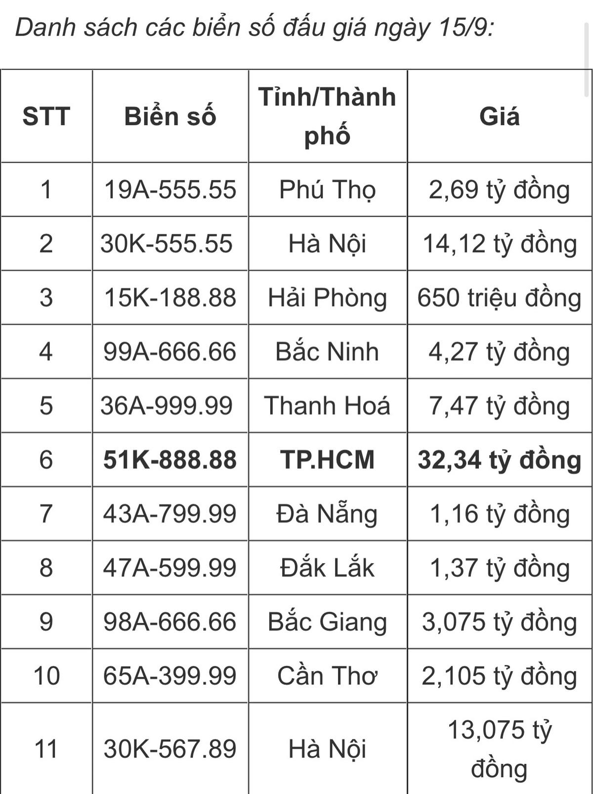 Hôm qua, ngày 15/9, Công ty Đấu giá hợp danh Việt Nam (VPA) tổ chức đấu giá thành công 11 biển số đẹp.
