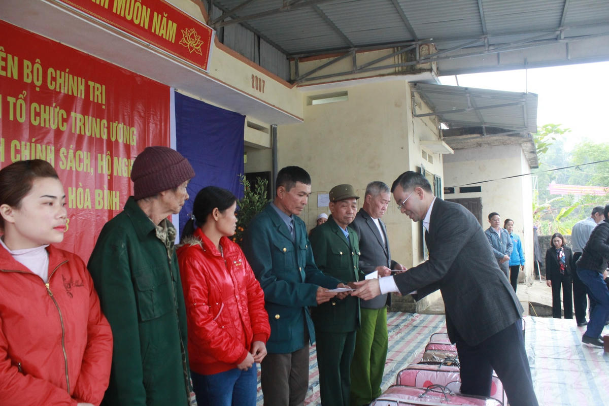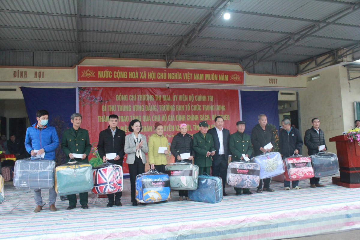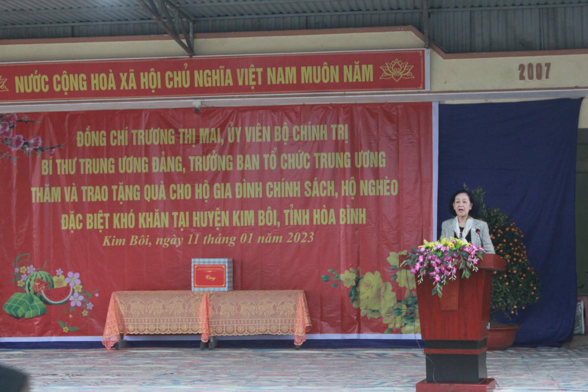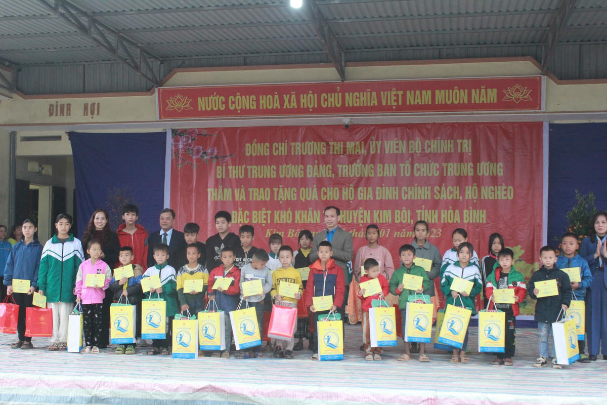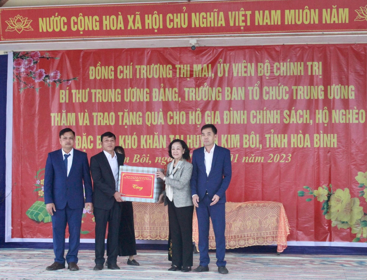 Nhân dịp này, bà Trương Thị Mai, Ủy viên Bộ Chính trị - Bí thư Trung ương Đảng, Trưởng Ban Tổ chức Trung ương chúc Tết và tặng quà Đảng bộ và Nhân dân tỉnh Hòa Bình, huyện Kim Bôi. Ủy ban Trung ương MTTQ Việt Nam tặng 350 suất quà; Ban Tổ chức Trung ương tặng 100 chiếc chăn.