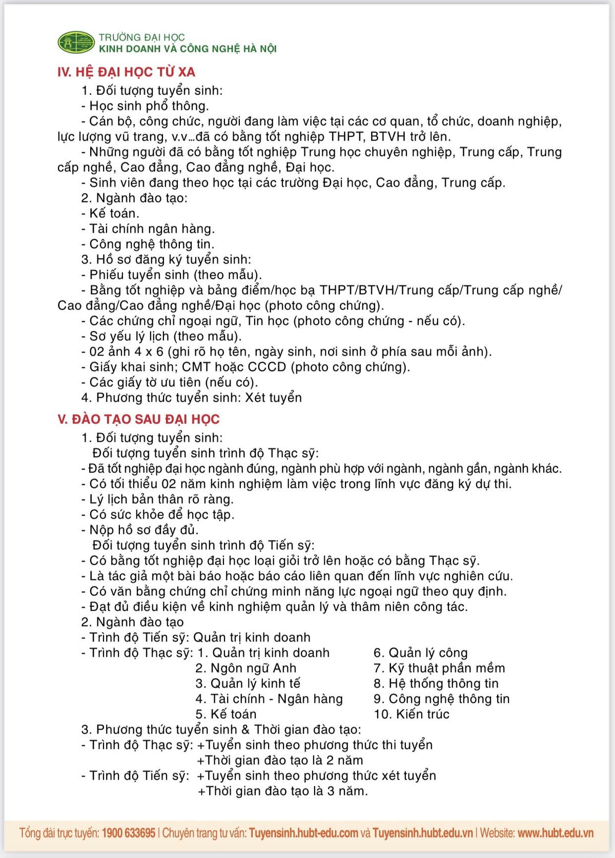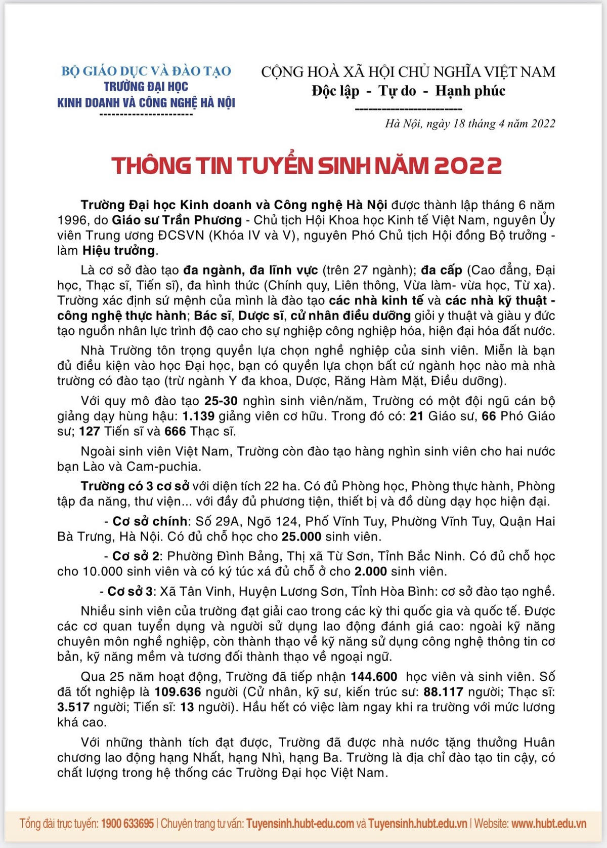 Trường Đại học Kinh doanh và Công nghệ Hà Nội tuyển sinh năm 2022 Thứ Sáu 29/04/2022 10:33 (GMT+7) Trường Đại học Kinh doanh và Công nghệ Hà Nội tuyển sinh năm 2022 các hệ đại học chính quy, đại học liên thông, đại học văn bằng 2, đại học từ xa, sau đại học, vừa làm vừa học.