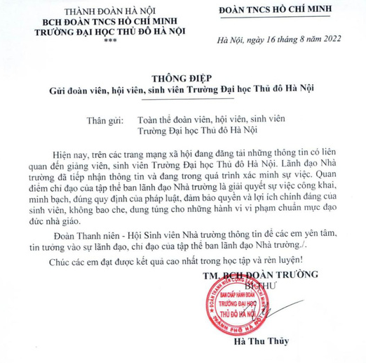 Trong chiều 16/8, bí thư Đoàn Trường ĐH Thủ đô Hà Nội cũng đã có văn bản gửi đến đoàn viên, hội viên, sinh viên nhà trường thông báo nhà trường đã tiếp nhận thông tin và đang trong quá trình xác minh sự việc.