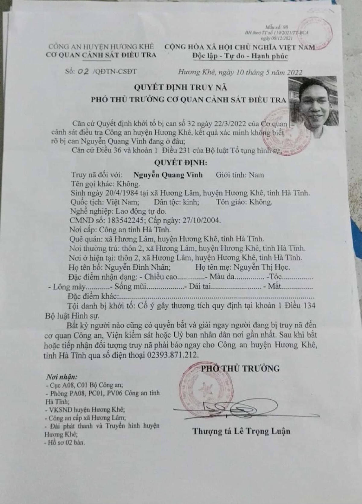 Cơ quan CSĐT Công an huyện Hương Khê (Hà Tĩnh) đang truy nã Nguyễn Quang Vinh về tội “Cố ý gây thương tích”.