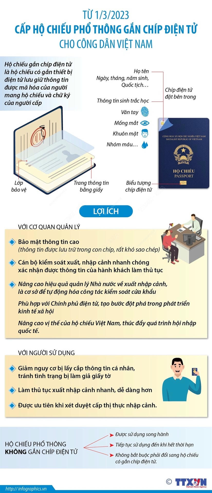 Từ ngày 1/3/2023, Bộ Công an và Cơ quan đại diện Việt Nam tại nước ngoài triển khai cấp Hộ chiếu phổ thông có gắn chíp điện tử cho công dân Việt Nam theo Luật Xuất cảnh, nhập cảnh của công dân Việt Nam.