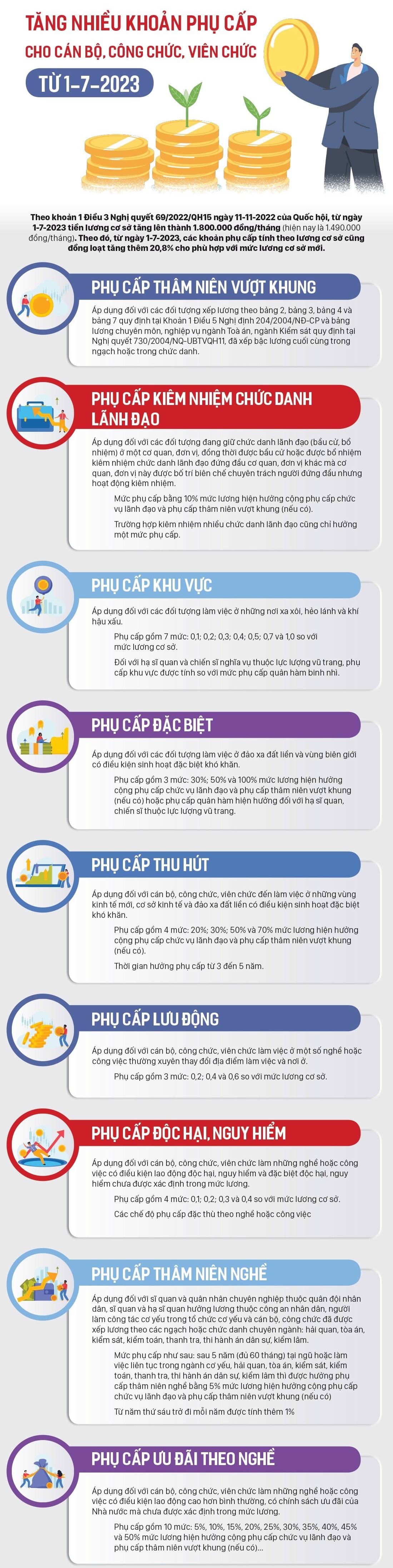 Từ ngày 1/7/2023, tiền lương cơ sở tăng lên thành 1,8 triệu đồng/tháng. Theo đó, các loại phụ cấp của cán bộ, công chức, viên chức (phụ cấp thâm niên vượt khung; phụ cấp kiêm nhiệm chức danh lãnh đạo; phụ cấp khu vực; phụ cấp đặc biệt; phụ cấp thu hút; phụ cấp lưu động; phụ cấp độc hại, nguy hiểm; phụ cấp thâm niên nghề; phụ cấp ưu đãi theo nghề) cũng được điều chỉnh phù hợp với mức lương cơ sở mới.