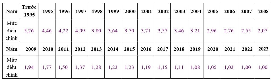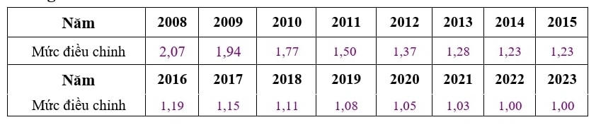 Trong đó, mức điều chỉnh tiền lương đã đóng BHXH của năm tương ứng được thực hiện theo bảng dưới đây:
