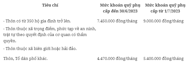Cụ thể, mức khoán quỹ phụ cấp với những người hoạt động không chuyên trách ở thôn, tổ dân phố chi tiết từ ngày 1/8/2023 như sau: