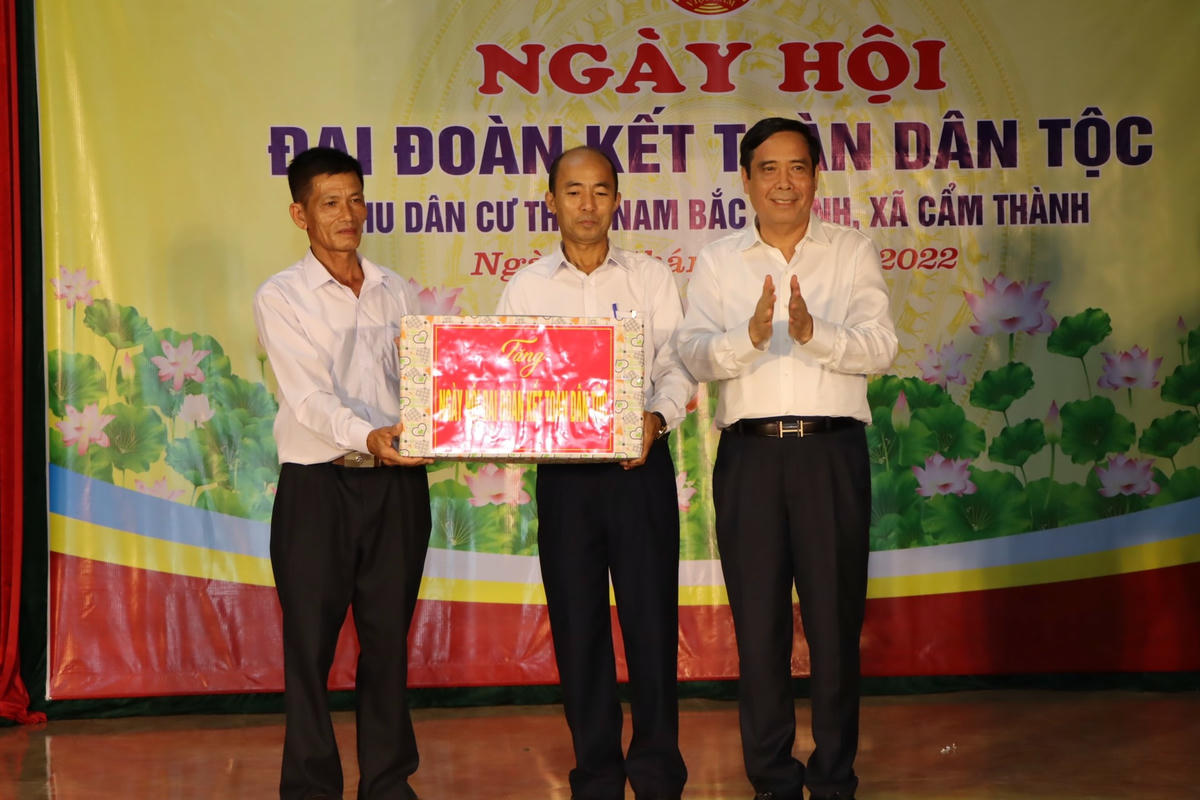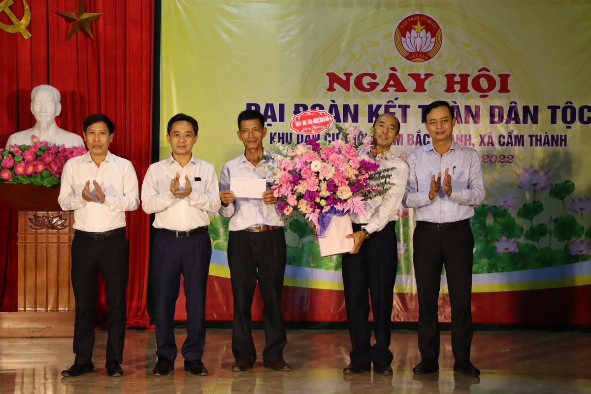 Nhân dịp này, Chủ tịch Hội Người cao tuổi Việt Nam Nguyễn Thanh Bình cùng lãnh đạo tỉnh Hà Tĩnh đã tặng hoa và quà chúc mừng Ban công tác Mặt trận thôn Nam Bắc Thành, xã Cẩm Thành nhân Ngày hội Đại đoàn kết toàn dân tộc.