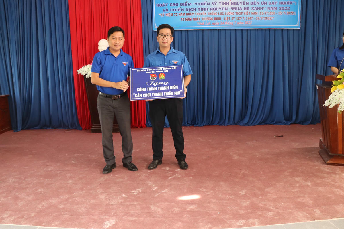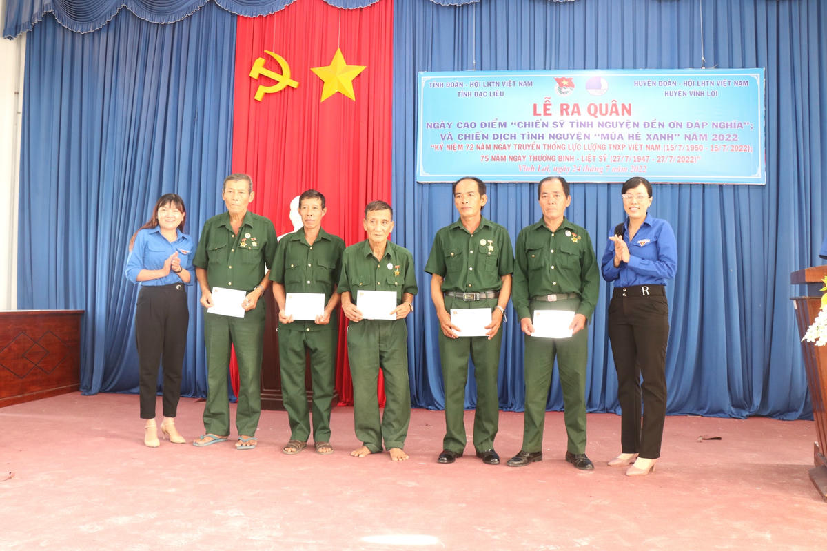 Dịp này, Ban tổ chức đã trao 20 suất quà cho cựu Thanh niên xung phong và hộ gia đình có công với cách mạng; trao 2 máy lọc nước cho 2 Mẹ Việt Nam Anh hùng; trao tặng vườn cây, ao cá cho hộ gia đình chính sách; trao tặng 1 công trình sân chơi thanh thiếu nhi cho xã Vinh Hưng huyện Vĩnh Lợi.