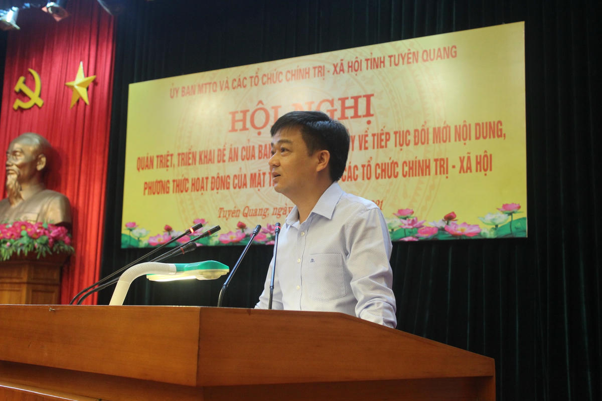 Sáng 5/7, tại Tuyên Quang, Ủy ban MTTQ tỉnh đã tổ chức Hội nghị quán triệt, triển khai Đề án của Ban Thường vụ Tỉnh ủy về “Tiếp tục đổi mới nội dung, phương thức hoạt động của MTTQ và các tổ chức chính trị - xã hội” theo hình thức trực tuyến tại 8 điểm cầu trên địa bàn tỉnh.
