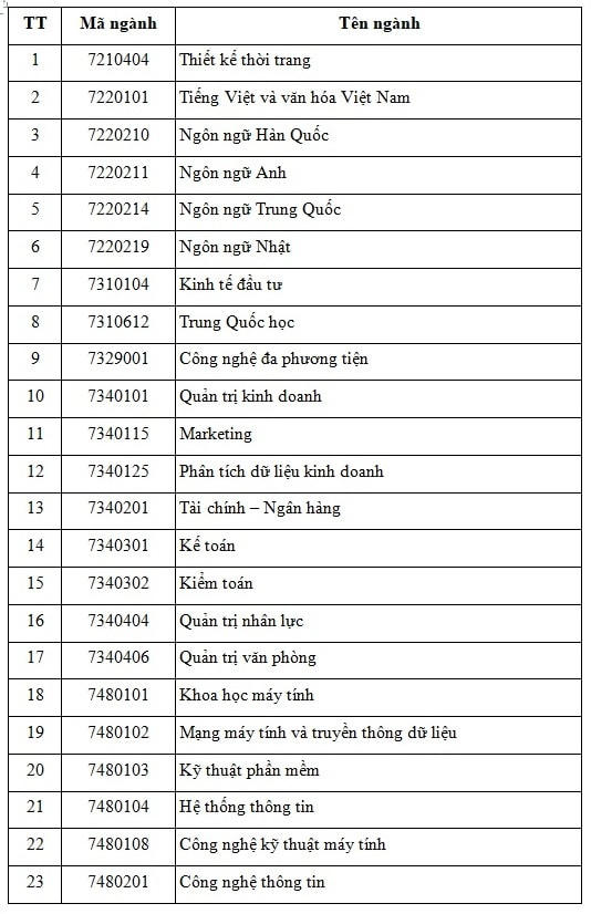* Danh mục ngành xét tuyển: