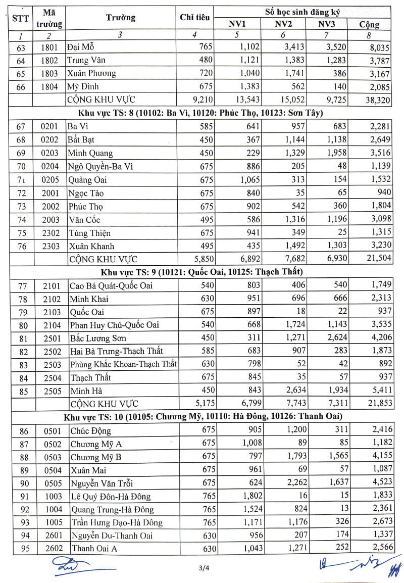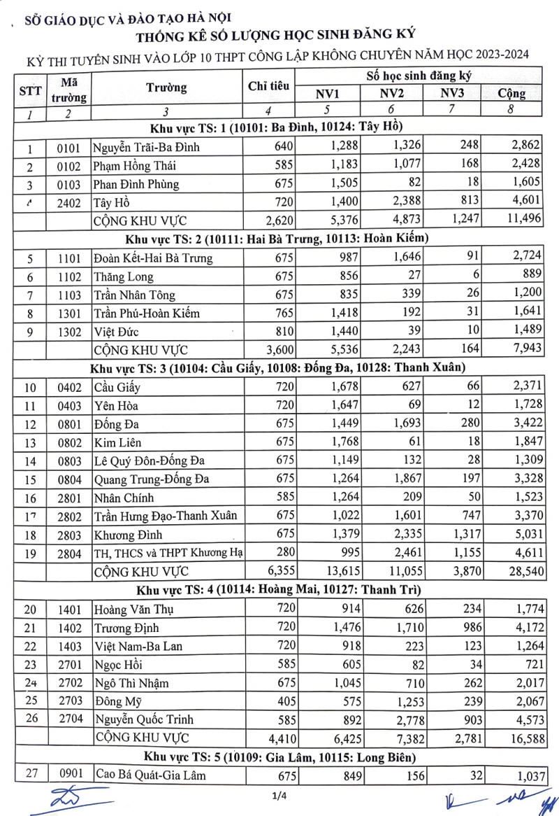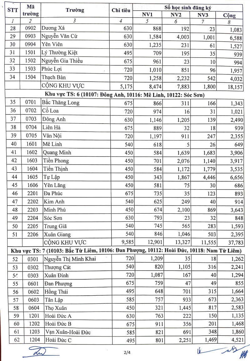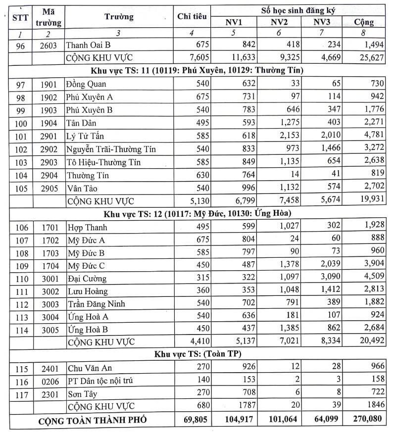 Ngày 17/5, Sở GDĐT Hà Nội công bố số lượng đăng ký dự tuyển vào từng trường. Theo đó, 104.917 thí sinh đăng ký nguyện vọng 1, 101.064 thí sinh đăng ký nguyện vọng 2 và 64.099 thí sinh đăng ký nguyện vọng 3.