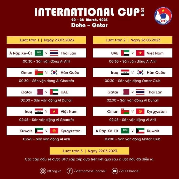 Theo lịch, U23 Việt Nam sẽ đối đầu với U23 Iraq vào lúc 22h45 ngày 22/3 theo giờ địa phương (tức 02h45 ngày 23/3 theo giờ Việt Nam) và gặp U23 UAE vào lúc 20h30 ngày 25/3 theo giờ địa phương (00h30 ngày 26/3 theo giờ Việt Nam).