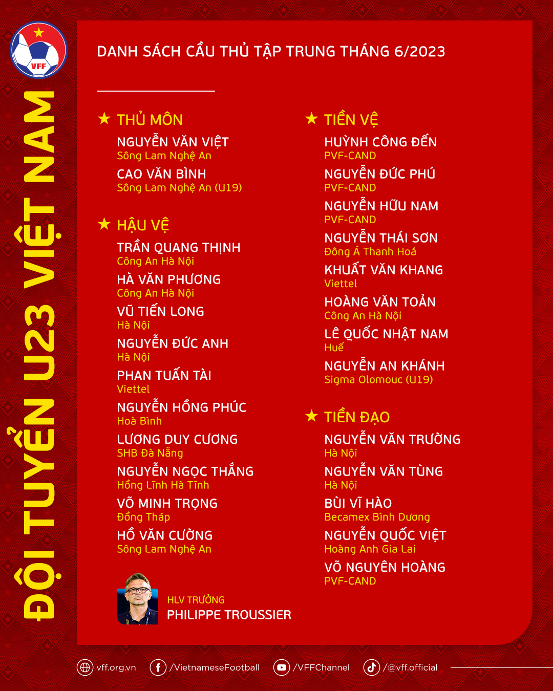 Ngày 2/6, tin từ Liên đoàn bóng đá Việt Nam cho biết, trong đợt hội quân tháng 6/2023 của ĐT U23 Việt Nam, HLV Philippe Troussier đã trao cơ hội cho nhiều gương mặt mới.