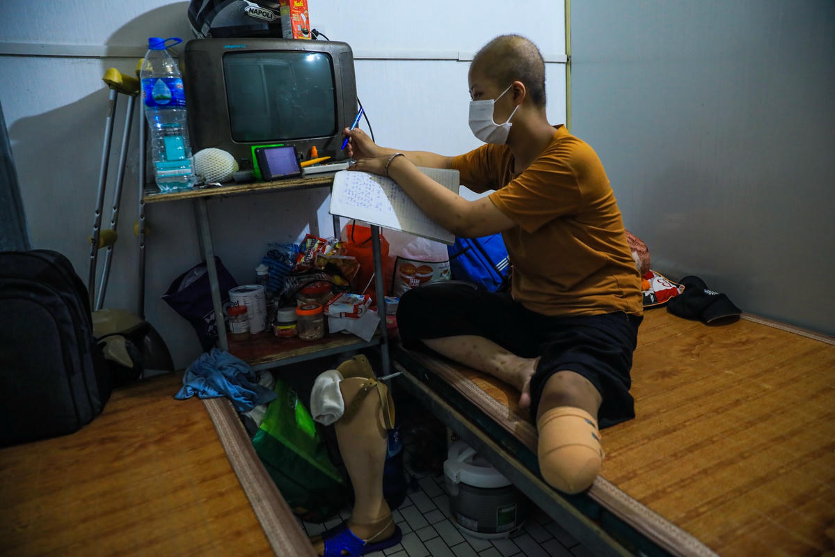 Trong căn phòng trọ chật hẹp chưa đầy 10 m2, anh Bùi Thanh Hòa gạt đi nước mắt để giúp con gái tháo chiếc chân giả chuẩn bị tắm rửa, vệ sinh cá nhân.