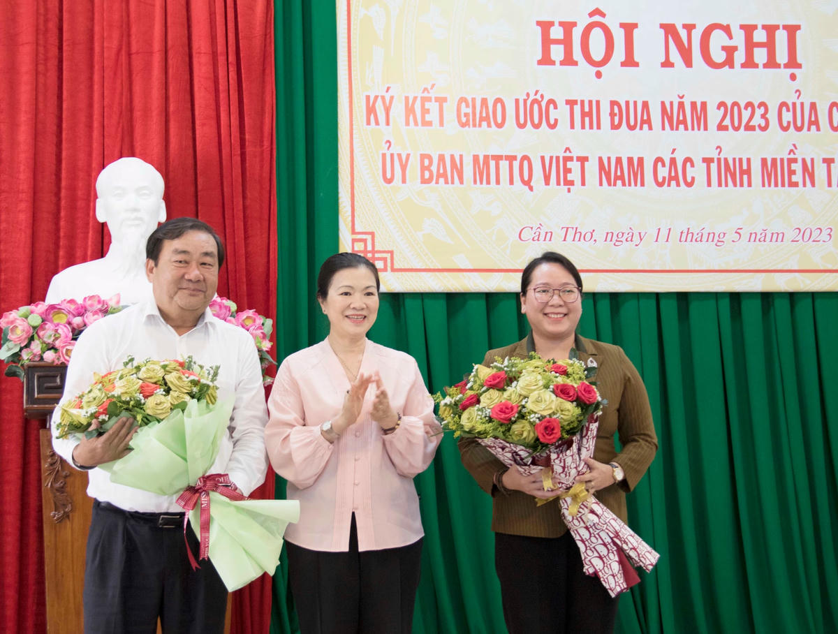 Trước sự chứng kiến của Phó Chủ tịch Ủy ban Trung ương MTTQ Việt Nam Trương Thị Ngọc Ánh, 12 đơn vị trong Cụm thi đua các tỉnh miền Tây Nam Bộ cùng nhau ký kết ký kết giao ước thi đua, cam kết tổ chức triển khai thực hiện tốt các nội dung đăng ký thi đua, phấn đấu hoàn thành xuất sắc các nhiệm vụ đề ra trong năm 2023.