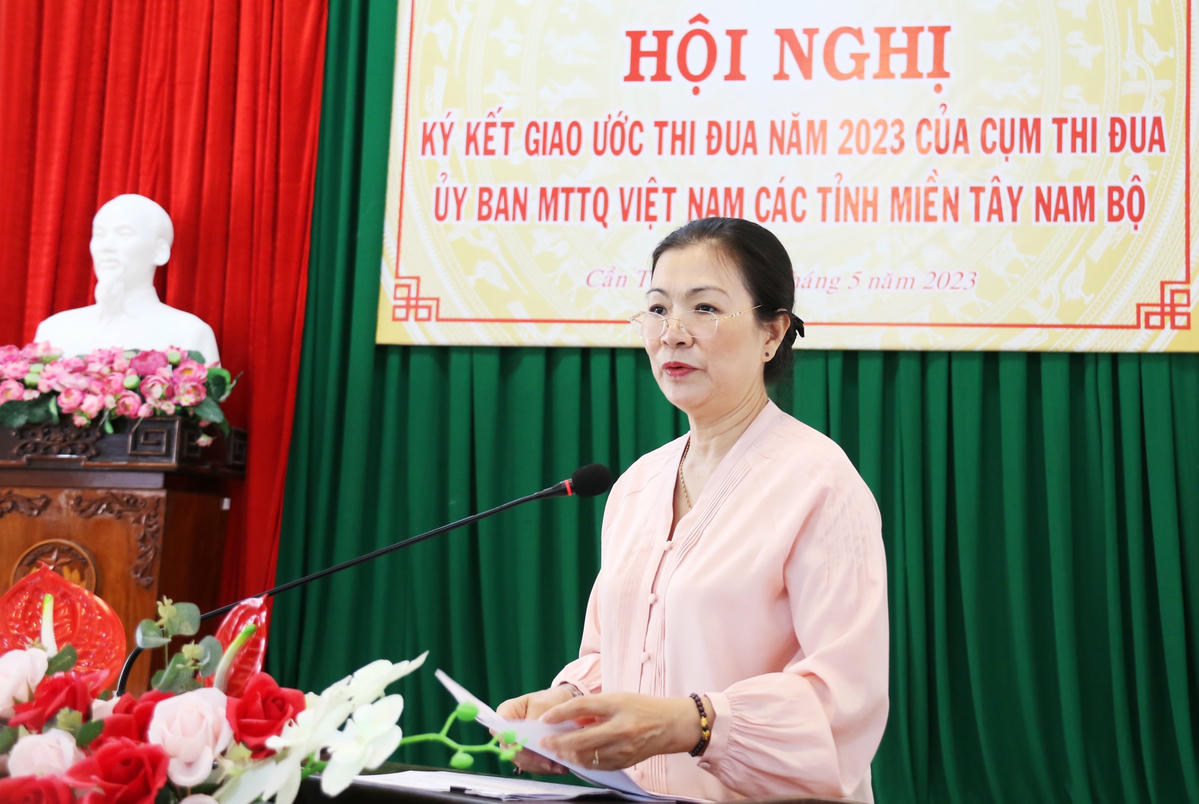 Sáng 11/5, Ban thường trực UBTƯ MTTQ Việt Nam tổ chức Hội nghị ký kết giao ước thi đua Cụm thi đua Uỷ ban MTTQ Việt Nam các tỉnh miền Tây Nam Bộ năm 2023, Phó Chủ tịch UBTƯ MTTQ Việt Nam Trương Thị Ngọc Ánh, phụ trách Cụm thi đua dự và chủ trì hội nghị.