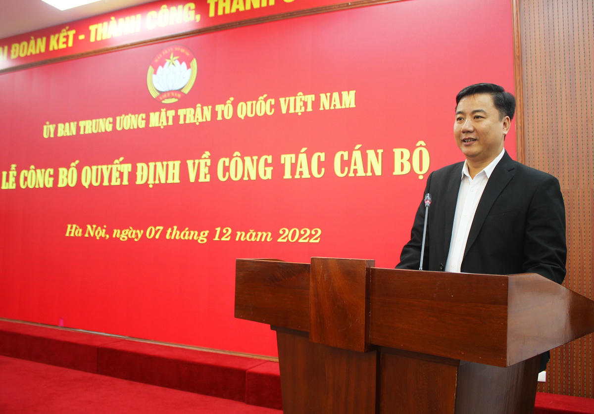 Thay mặt các công chức được bổ nhiệm nhận nhiệm vụ mới, ông Phạm Hồng Thanh, Trưởng phòng Tổng hợp – Thư ký, Văn phòng Cơ quan UBTƯ MTTQ Việt Nam khẳng định với vị trí công tác mới sẽ tiếp tục nỗ lực phấn đấu trong công tác, học hỏi kinh nghiệm, giữ gìn sự đoàn kết, thực hiện nghiêm các quy chế, quy định của cơ quan, hoàn thành tốt nhiệm vụ của Đảng đoàn, Ban Thường trực UBTƯ MTTQ Việt Nam giao phó.