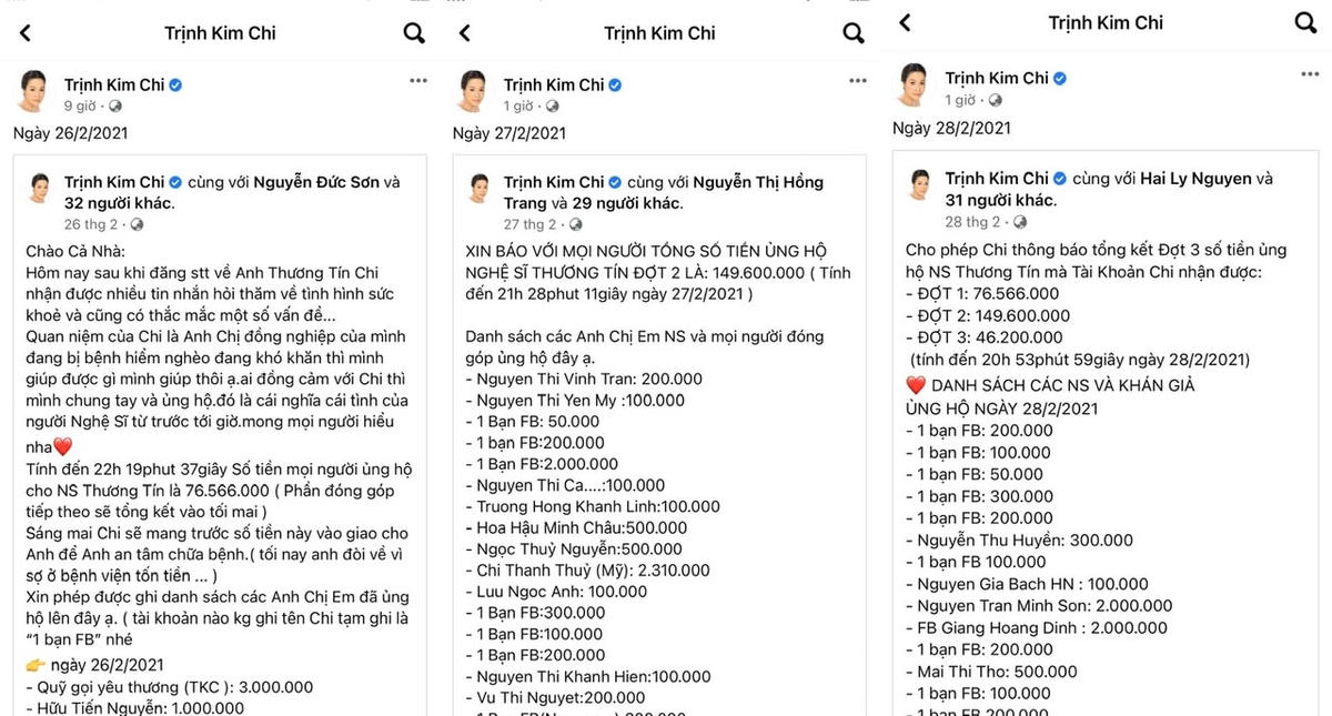 Trước động thái của đàn anh, Trịnh Kim Chi nhanh chóng phản hồi lên trang cá nhân. Theo đó, cô lật ngửa “ván bài” bằng cách chia sẻ hình ảnh chụp bản sao kê 3 đợt quyên góp từ thiện cho nghệ sĩ Thương Tín, ghi chú rõ ràng ngày - tháng - năm.