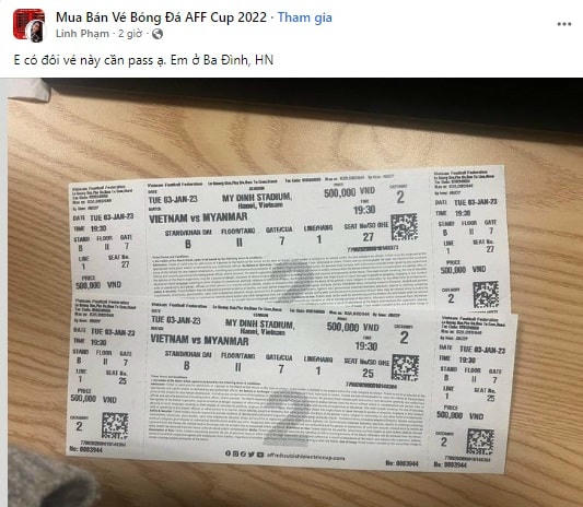Báo Công Thương cũng đưa tin: Trước trận đấu này, Liên đoàn Bóng đá Việt Nam (VFF) mở bán vé online cho người hâm mộ. Vé xem có 4 mệnh giá: 600.000 đồng/vé, 500.000 đồng/vé, 400.000 đồng/vé, 300.000 đồng/vé. Mỗi người dân có thể mua tối đa 4 vé. Nhưng theo khảo sát đến thời điểm chiều 3/1, nhiều “cò vé” đang gấp rút chốt đơn với giá 500.000 - 600.000 đồng/cặp vé.