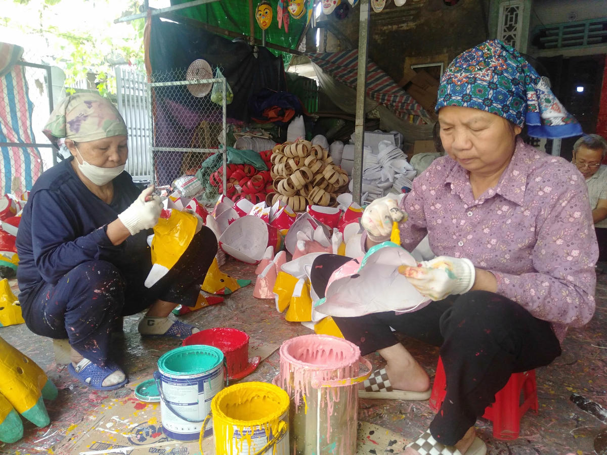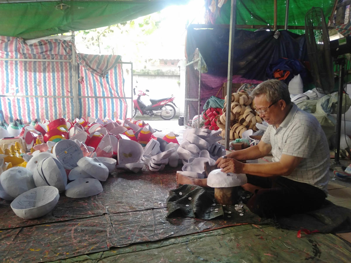Người thợ chỉ việc phết hồ nấu từ củ sắn xay thành bột lên khắp tờ bìa hay giấy báo rồi bồi vào khuôn mẫu làm bằng xi măng. Bồi đủ 3 lớp thì dỡ khỏi khuôn mẫu và đem phơi gió cho khô. Sau đó thì hoàn thiện bằng cách tô màu. Ông Đông nói thêm: “Ngay đến sơn để tô vẽ màu cho mặt nạ hay đầu sư tử cũng là thứ sơn không dầu. Do vậy sản phẩm không có mùi dầu, trẻ em có đeo vào mặt hay đội lên đầu cũng rất an toàn”.