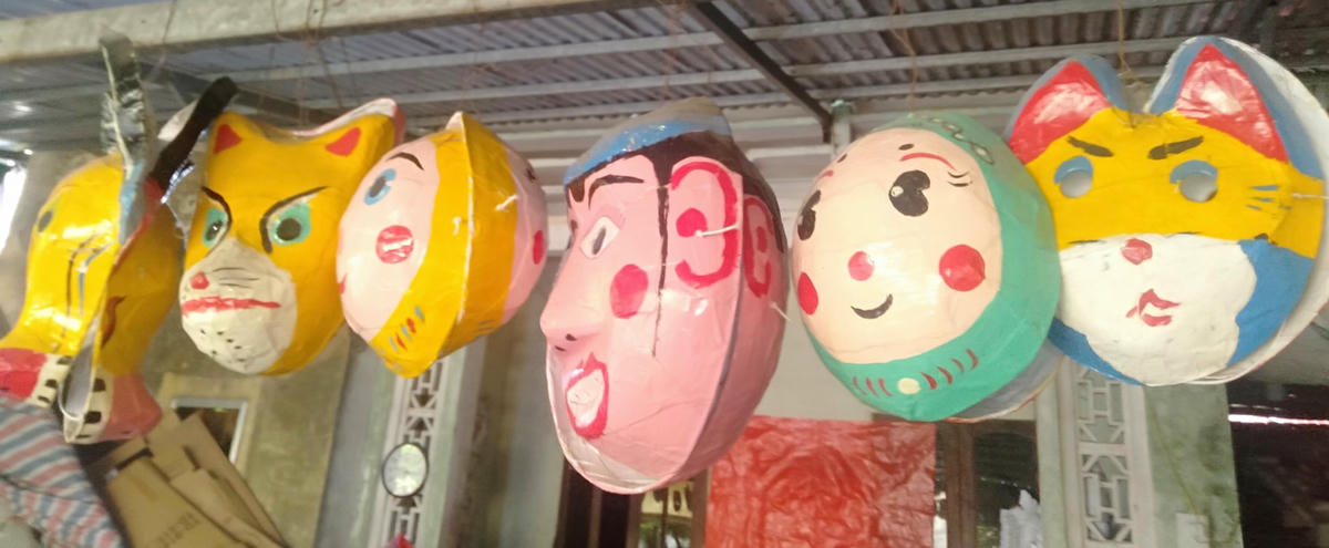 Đã tới nhà ông Vũ Huy Đông, thật may đang là “thời vụ” nên tôi được thoải mái chiêm ngưỡng và hỏi về chuyện làm đồ chơi trung thu. Tuy được gọi là làng đồ chơi trung thu nhưng sản phẩm của làng đa phần là mặt nạ và trống trung thu. Nếu như xưa là mặt nạ lấy mẫu từ chuyện Tây Du Ký thì nay mẫu mã đa dạng hơn. Ông Đông cho biết: “Mẫu mặt nạ hiện được trẻ em khắp nơi yêu thích là những mẫu có tích từ truyện dân gian Việt Nam, đó là những con vật thân gần với trẻ nhỏ như: Chó, mèo, nai, hươu... Còn với nhân vật thì là: Chú cuội, thằng bờm, chú tễu...”.