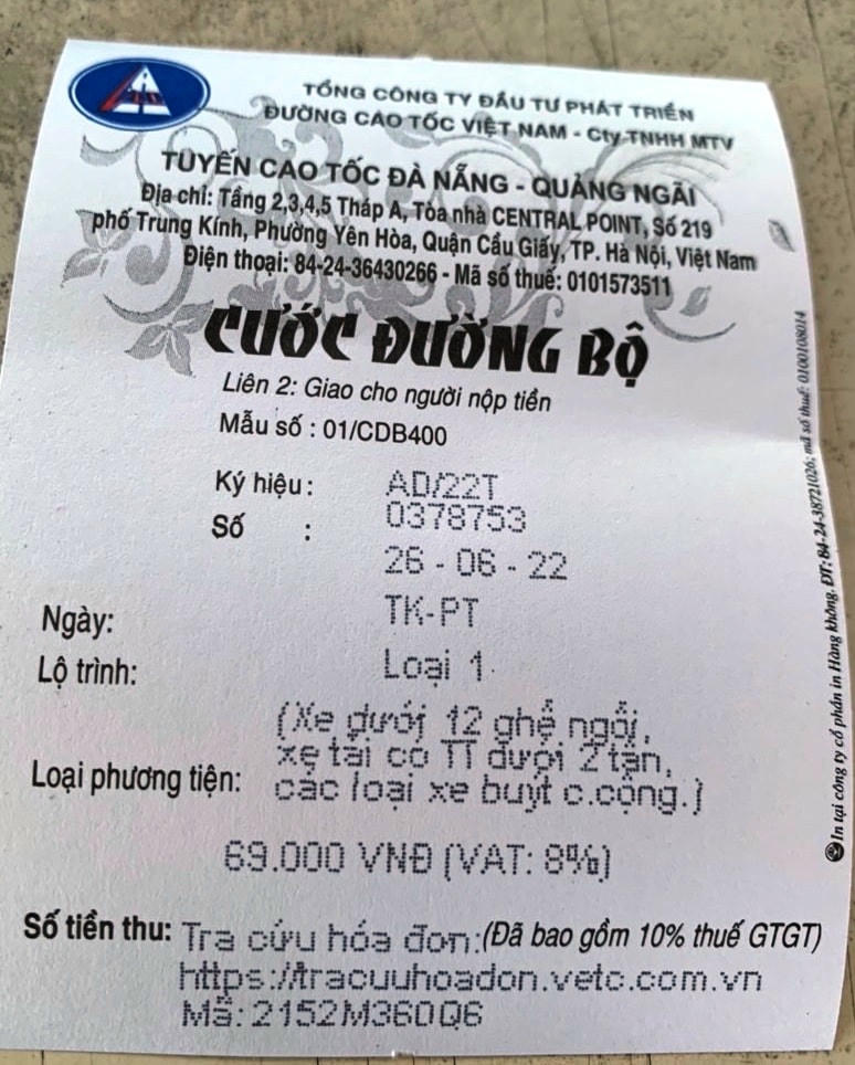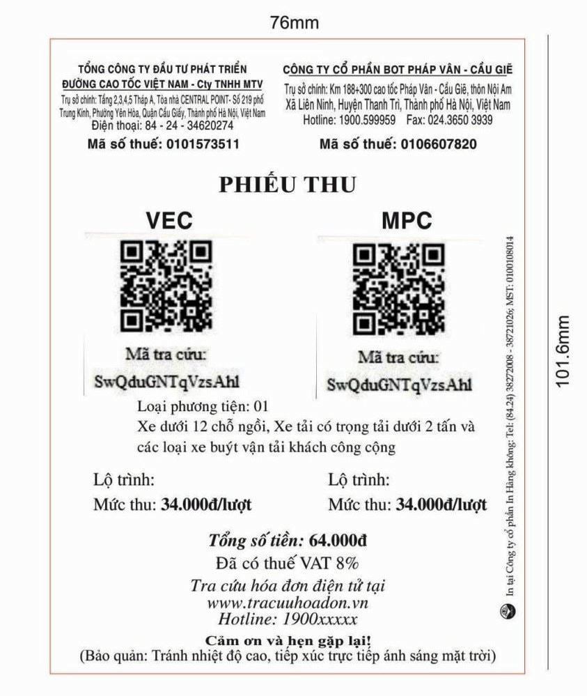 Theo đó, triển khai thực hiện Nghị định số 123/2020/NĐ-CP và Thông tư 78/2021/TT-BTC, VEC thông báo: “Kể từ 0h ngày 1/7/2022 các trạm thu phí trên các tuyến cao tốc do VEC quản lý, khai thác sẽ không phát hành hóa đơn tự in (hoặc hóa đơn in sẵn) cho Quý khách khi Quý khách thanh toán phí dịch vụ sử dụng đường bộ cao tốc. Thay vào đó, Quý khách sẽ nhận được phiếu thu tiền dưới hình thức tự in (hoặc in sẵn) để ra khỏi đường cao tốc. Sau khi nhận được phiếu thu tiền, Quý khách vui lòng tra cứu vào đường link http://tracuuhoadon.vetc.com.vn và nhập mã tra cứu hóa đơn (hoặc mã vé) được in sẵn trên phiếu thu để tra cứu thông tin hóa đơn được kết nối trực tiếp với Tổng cục Thuế”.
