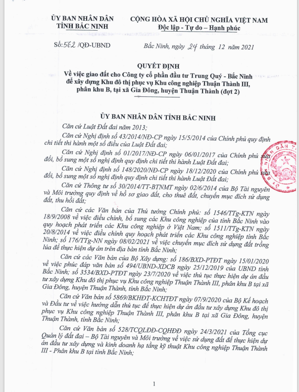 Đến ngày 24/12/2021, UBND tỉnh Bắc Ninh tiếp tục ban hành Quyết định (số 562/QĐ-UBND) giao 75.222,4 m2 đất cho Công ty cổ phần đầu tư Trung Quý-Bắc Ninh để xây dựng Khu đô thị phục vụ KCN Thuận Thành 3, phân khu B (đợt 2).