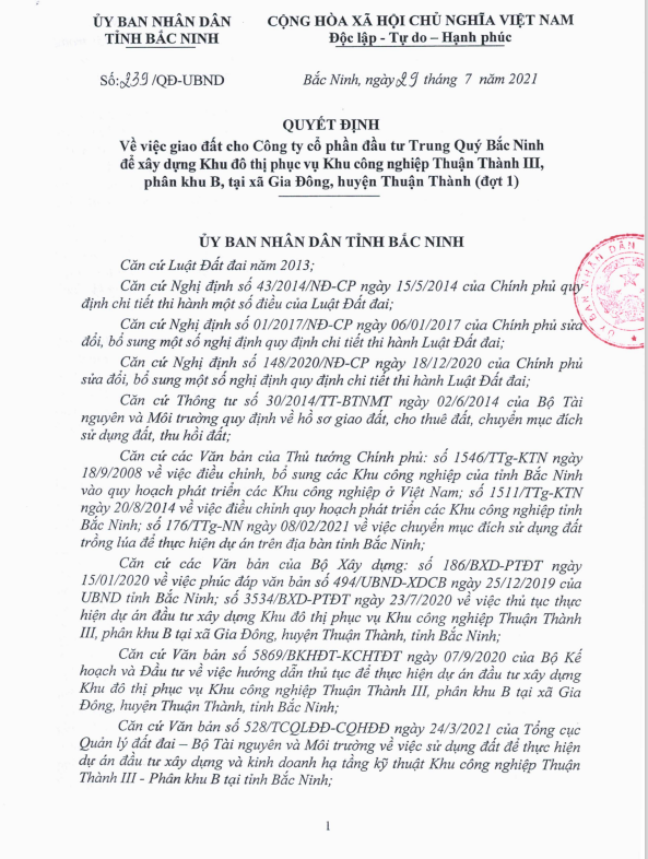 Ngày 29/7/2021, UBND tỉnh Bắc Ninh ban hành Quyết định (số 239/QĐ-UBND) giao 618.539,5 m2 đất cho Công ty cổ phần đầu tư Trung Quý-Bắc Ninh để xây dựng Khu đô thị phục vụ KCN Thuận Thành 3, phân khu B tại xã Gia Đông, huyện Thuận Thành (đợt 1).
