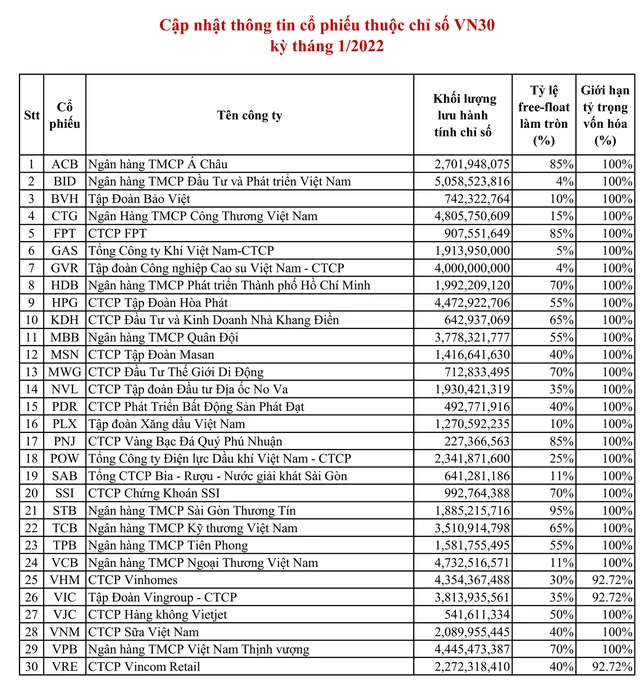 Trong khi đó, HoSE không có sự thay đổi về danh sách cổ phiếu thành phần rổ VN30 và VNFinlead trong kỳ cơ cấu này.