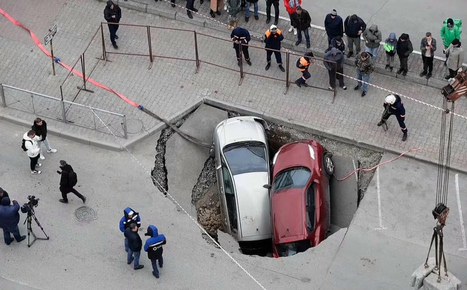 Một hố sâu chứa đầy nước nóng bất ngờ xuất hiện bên ngoài một trung tâm thương mại ở vùng Siberia thuộc Nga đã "nuốt chửng" hai chiếc xe hơi đậu phía trên.