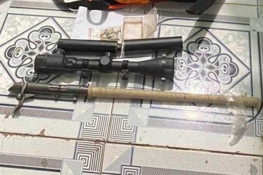 Qua khám xét, công an thu giữ 1 khẩu súng (dạng súng săn, không có báng súng), 1 vỏ đạn, 8 viên đạn, 1 nón bảo hiểm, 1 ba lô, 1 thùng xốp và hơn 500.000 đồng.