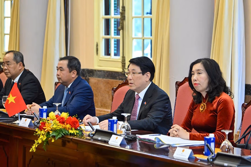 Thông tin tới Chủ tịch Hội đồng Châu Âu những kết quả chính của Đại hội đại biểu toàn quốc lần thứ XIV của Đảng, Chủ tịch nước nhấn mạnh hai mục tiêu chiến lược 100 năm của Việt Nam: đến năm 2030 trở thành nước đang phát triển có công nghiệp hiện đại, thu nhập trung bình cao và đến năm 2045 trở thành nước phát triển, thu nhập cao; quyết tâm của Việt Nam xây dựng mô hình tăng trưởng mới dựa trên khoa học – công nghệ, đổi mới sáng tạo, chuyển đổi số và chuyển đổi xanh là một trong những nhiệm vụ trọng tâm. Chủ tịch nước khẳng định Việt Nam sẵn sàng cùng EU tiếp tục đồng hành trong kỷ nguyên phát triển mới.