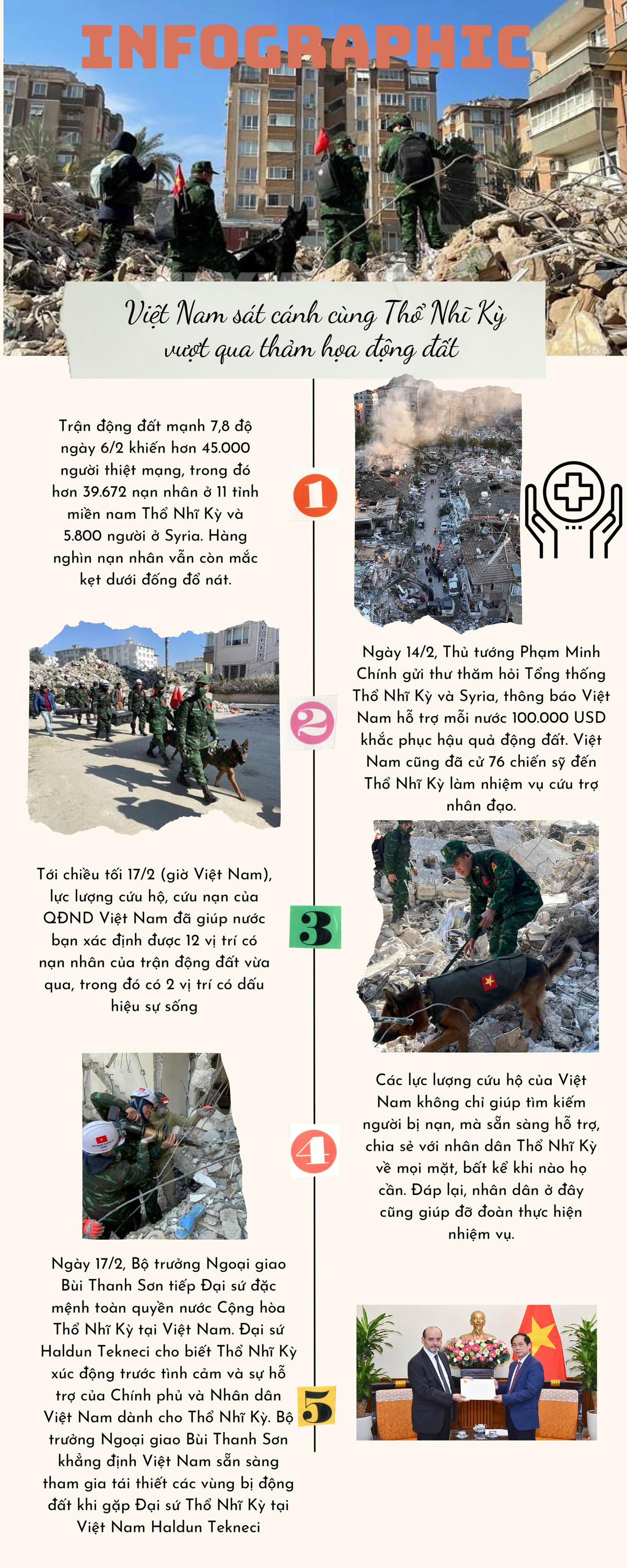 Việt Nam sát cánh cùng Thổ Nhĩ Kỳ vượt qua thảm họa động đất Thứ Hai 20/02/2023 14:00 (GMT+7) Các lực lượng cứu hộ của Việt Nam không chỉ giúp tìm kiếm người bị nạn trong trận động đất, mà sẵn sàng hỗ trợ, chia sẻ với nhân dân Thổ Nhĩ Kỳ về mọi mặt, bất kể khi nào họ cần.. Thanh Bình