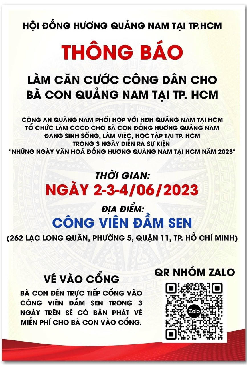 Mới đây nhất, Công an tỉnh Quảng Nam đã phối hợp với Hội đồng hương Quảng Nam vào TP Hồ Chí Minh làm thẻ CCCD cho bà con đồng hương Quảng Nam đang sinh sống, làm việc, học tập tại TP Hồ Chí Minh.