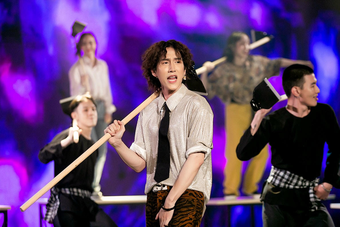 Ngoài ra, VP Bá Vương còn biến sân khấu bùng nổ hơn khi mang rất nhiều đạo cụ, thể hiện đúng với tinh thần của bài hát, càng khiến khán giả phải gật gù với tiết mục có sự đầu tư vô cùng chỉn chu của anh chàng.