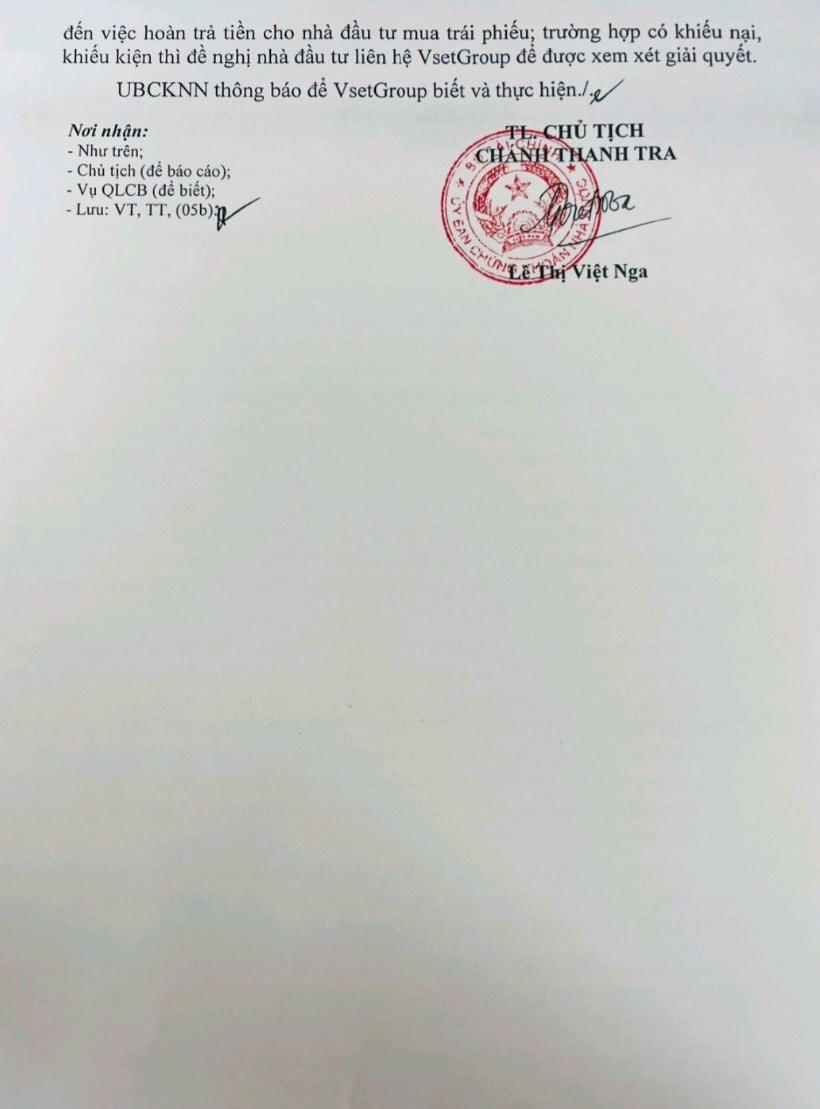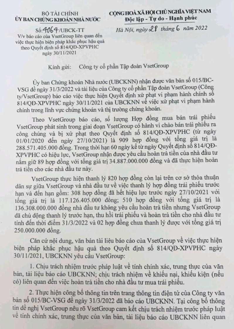 VsetGroup thực hiện thanh lý 820 hợp đồng còn lại trên cơ sở thỏa thuận dân sự giữa VsetGroup với nhà đầu tư về việc thanh lý hợp đồng trái phiếu trước hạn và đến hạn gồm: 308 hợp đồng đã hết hiệu lực trước ngày 27/10/2021 với tổng giá trị là 117.126.405.000 đồng. 510 hợp đồng với tổng giá trị là 136.308.000.000 đồng nhà đầu tư không yêu cầu hoàn tiền nhưng VsetGroup đã chủ động thanh lý trước hạn, thu hồi trái phiếu, đồng thời hoàn trả tiền cho nhà đầu tư tính đến thời điểm 31/3/2022 và 02 hợp đồng chưa thanh lý được với tổng giá trị 250.000.000 đồng”. Công văn trên được bà Lê Thị Việt Nga – Chánh Thanh tra thuộc Ủy ban Chứng khoán Nhà nước, ký, đóng dấu.