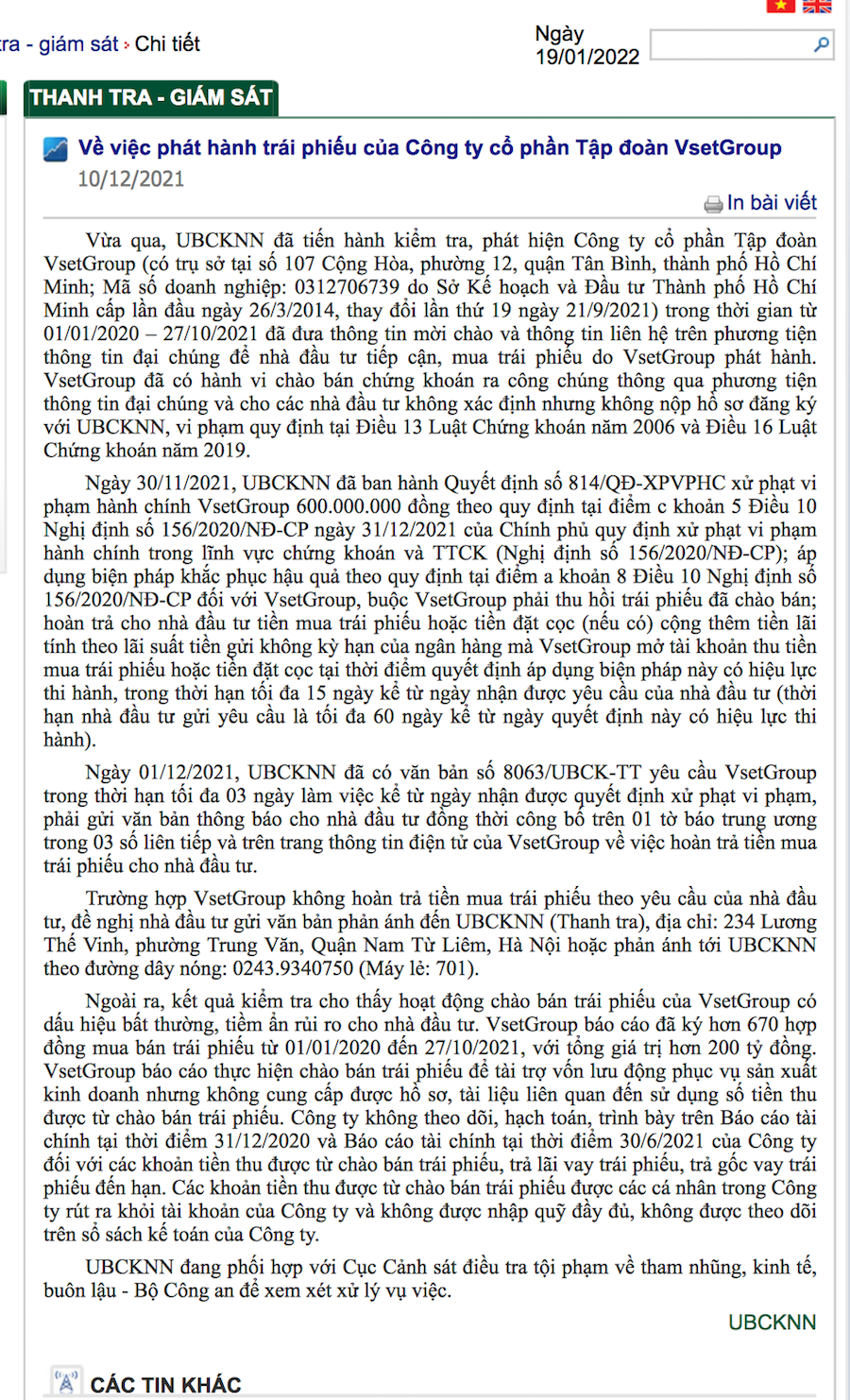 Liên quan tới vụ việc nêu trên, trước đó, phía UBCKNN tiến hành kiểm tra, phát hiện Công ty cổ phần Tập đoàn VsetGroup (có trụ sở tại số 107 Cộng Hòa, phường 12, quận Tân Bình, TP Hồ Chí Minh), trong thời gian từ 01/01/2020 - 27/10/2021 đưa thông tin mời chào và thông tin liên hệ trên phương tiện thông tin đại chúng để nhà đầu tư tiếp cận, mua trái phiếu do VsetGroup phát hành.