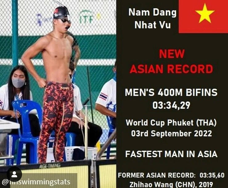 Đáng chú ý ở nội dung 400 m nam chân vịt đôi, Vũ Đặng Nhật Nam phá kỷ lục châu Á với thời gian 3 phút 34 giây 29. Thành tích này của Nhật Nam đã phá kỷ lục cũ trước đó của vận động viên người Trung Quốc Zhihao Wang thiết lập năm 2019 với thời gian 3 phút 35 giây 60.