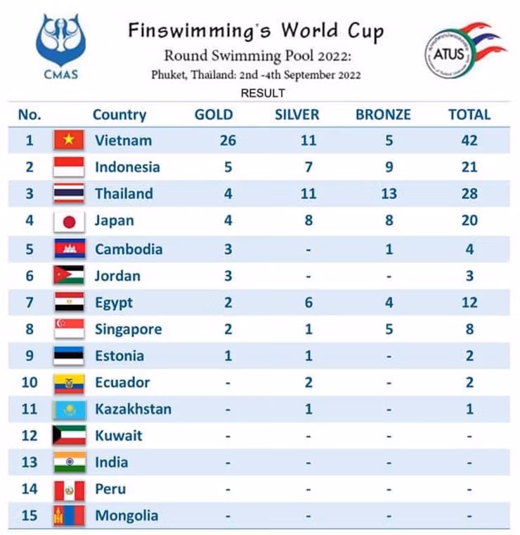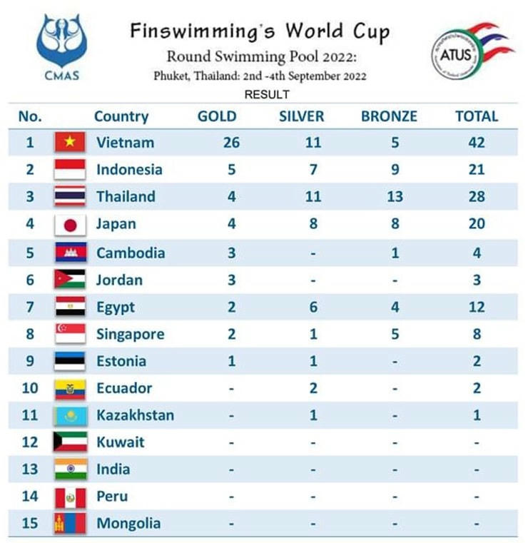 Với 26 HCV, đội tuyển lặn Việt Nam đứng đầu toàn đoàn ở World Cup 2022, trong khi Indonesia đứng thứ hai với chỉ 5 HCV.