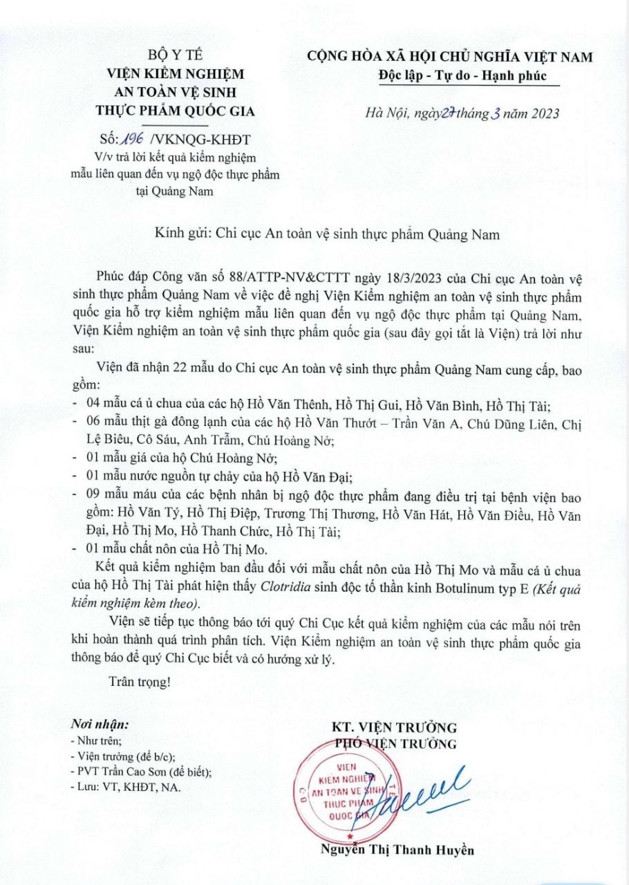 “Kết quả kiểm nghiệm ban đầu đối với mẫu chất nôn của Hồ Thị Mo và mẫu cá ủ chua của hộ Hồ Thị Tài phát hiện thấy Clotridia sinh độc tố thần kinh Botulinum typ E. Viện sẽ tiếp tục thông báo tới quý Chi Cục kết quả kiểm nghiệm của các mẫu nói trên khi hoàn thành quá trình phân tích. Viện Kiểm nghiệm ATVSTP Quốc gia thông báo để quý Chi Cục biết và có hướng xử lý”, văn bản của Viện Kiểm nghiệm ATVSTP Quốc gia nêu rõ.