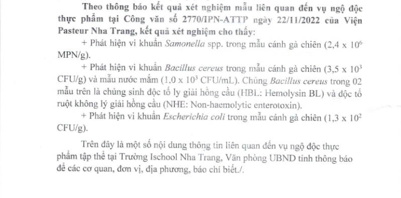 Theo thông báo kết quả xét nghiệm mẫu liên quan đến vụ ngộ độc thực phẩm của Viện Pasteur Nha Trang, kết quả xét nghiệm cho thấy: Phát hiện vi khuẩn Samonella spp. trong mẫu cánh gà chiên, vi khuẩn Bacillus cereus trong mẫu cánh gà chiên và mẫu nước mắm. Chủng Bacillus cereus trong 2 mẫu trên là chủng sinh độc tố lý giải hồng cầu và độc tố ruột không lý giải hồng cầu. Đồng thời, phát hiện vi khuẩn Escherichia coli trong mẫu cánh gà chiên.